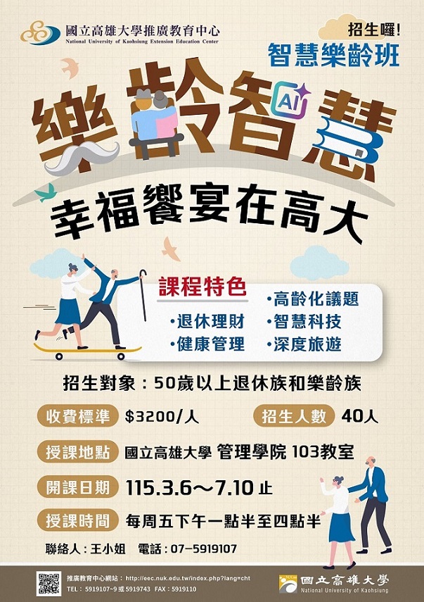 存股達人謝士英教授/國立高雄師範大學工業教育系教授/美國賓州州立大學工業教育博士 | 管理學院103教室 | 樂齡存股健檢 *本課程僅對智慧樂齡班學員開放,不開放單次選修。 |