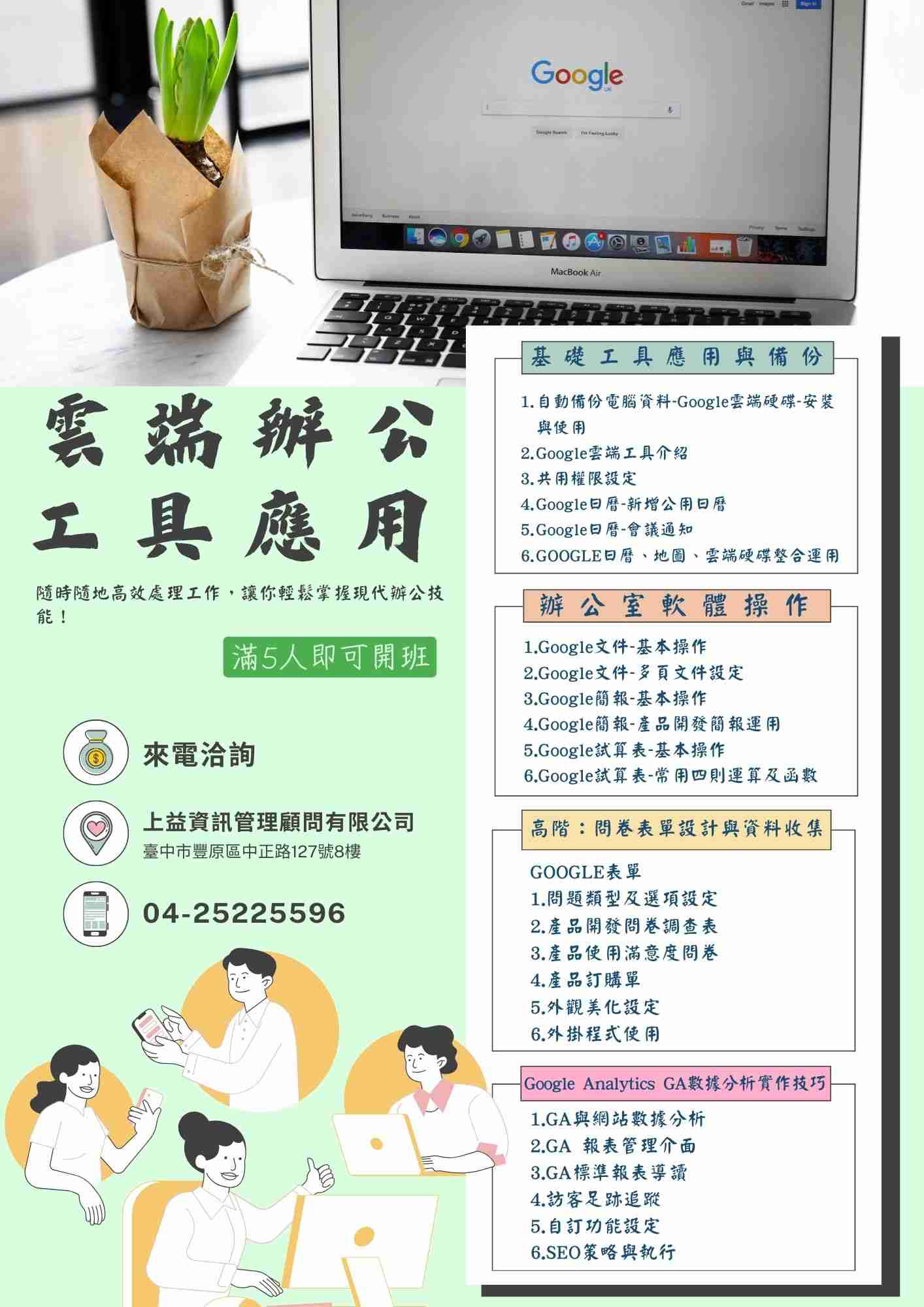 隨著遠距工作與雲端協作成為職場趨勢,Google 系列工具已成為企業最常用的辦公平台。本課程以實作方式帶領學員熟悉雲端檔案管理、表單資料收集、協作編輯、GA流量分析等技能,協助你快速提升辦公效率與數位能力。