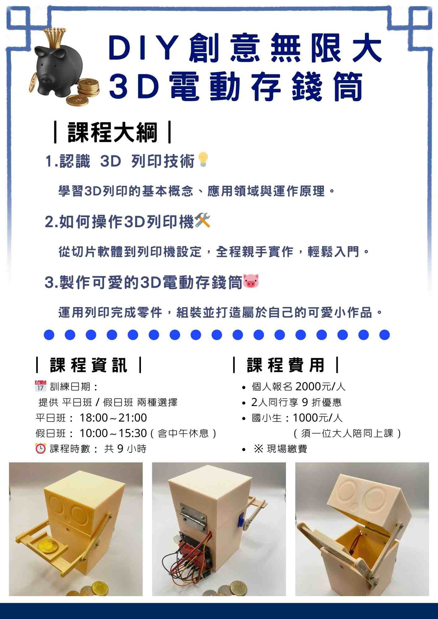 透過本課程,學員將親手操作 3D 列印機,了解列印原理,並完成一個 會動的3D創意存錢筒!不論是親子同樂、培養孩子的動手能力,或大人想體驗3D列印手作樂趣都非常適合。