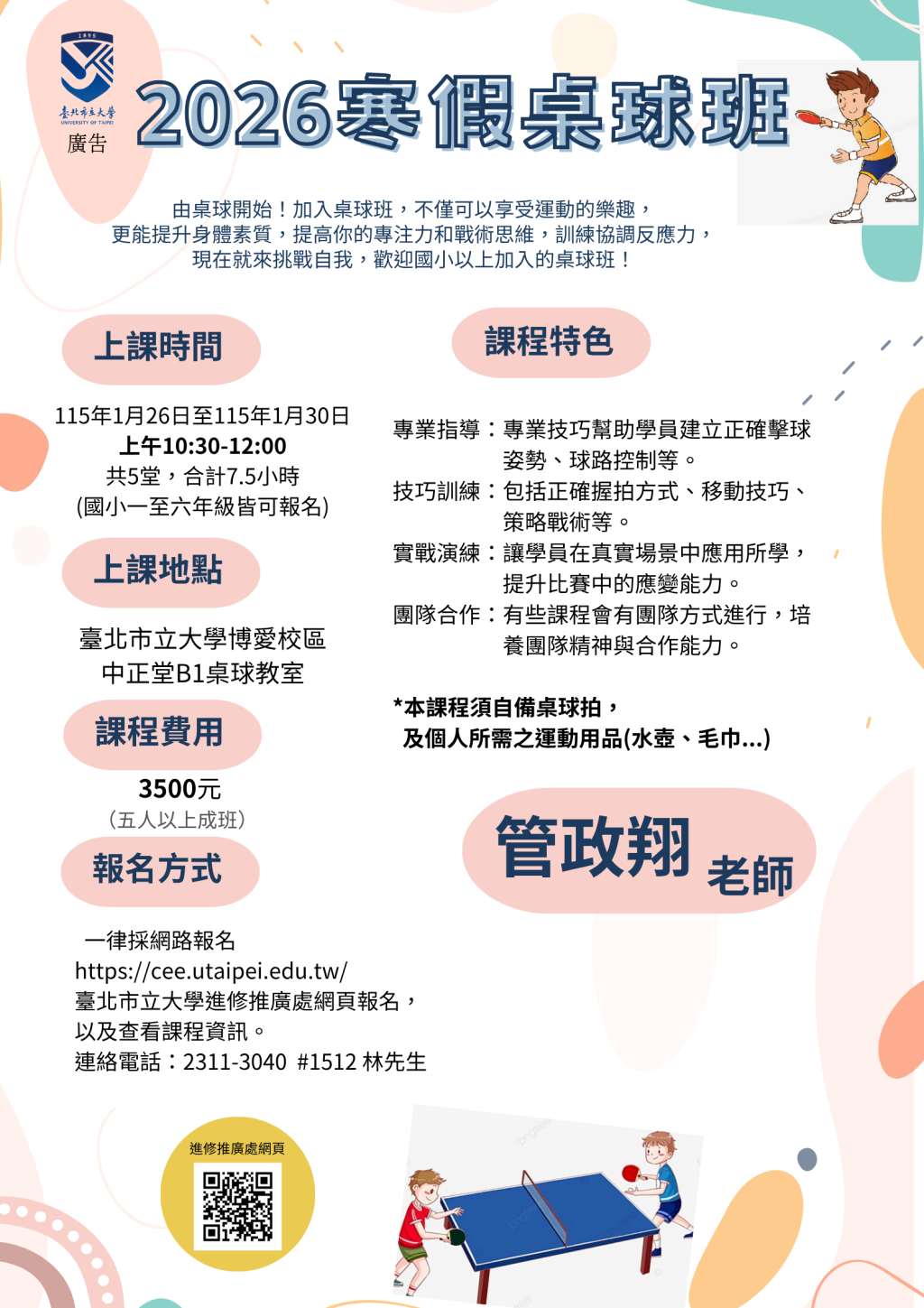 現在就來挑戰自我,歡迎國小以上加入的桌球班!