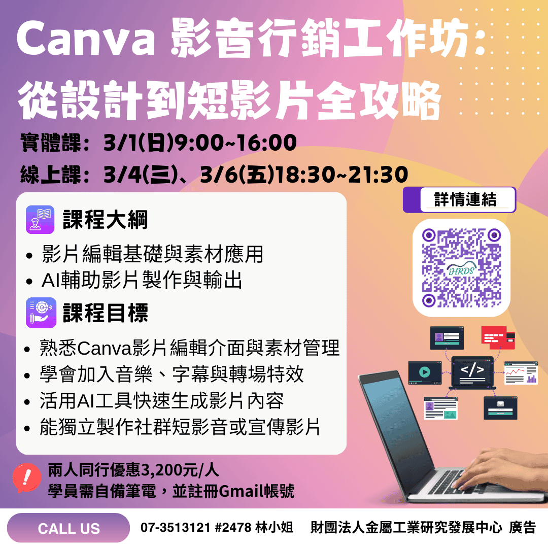想讓你的品牌影片更吸睛又不費時嗎?本課程專為已有Canva基礎的設計使用者打造,結合AI智慧工具,帶你從影片編輯介面操作到AI自動生成實戰,快速掌握短影音製作全流程。課程以實作為核心,從素材管理、字幕與音樂搭配,到AI生成影片內容,協助學員在短時間內製作出具備專業感與創意的宣傳影片。無論是企業行銷、個人品牌經營,或社群內容創作,都能靈活應用,打造令人印象深刻的視覺作品。