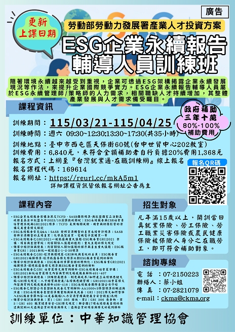 - 4.個案分組討論與發表:利害關係人關切議題的排序與產生重大議題;ESG報告書GRI:2021新版一般揭露2-1~2-30標準(4小時)