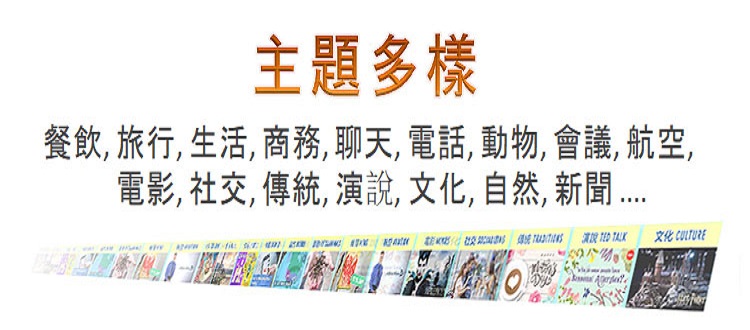 豐富多樣, 包含旅遊/生活/航空/餐飲故事/傳統/動物/自然/文化/科技/聊天/溝通/話題/新聞/電影/綜合/活動/商務英語/雅思備考課程