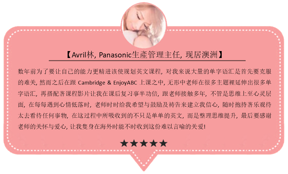 免費口語程度分析 ( 使用多益測驗和 CEFR 歐洲共同語文參考架構 ) 認識全球英語外師 ( 英國,美國, 紐西蘭, 澳洲, 加拿大和南非等歐美國家 ) 英商Cambridge International & EnjoyABC每年頒發英語修業證書。費用實惠,每周一堂課程且每月僅需 NTD3,200。名額有限,歡迎對英語口說及各國文化有興趣的你把握限額,額滿即止,請盡速申請。