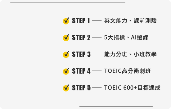 零基礎入門先修班 學習重點 建立解題觀念和應考信心,第一次考多益也不怕 檢定助攻 一對一程度檢視,針對弱點安排學習進度 逐題解析考試內容,增加考試題型熟悉度 聽力、閱讀延伸學習,提升英語基礎語感 課程內容 檢視字彙熟悉程度,擬訂應考準備策略 加強關鍵字與同義字敏感度,提升解題速度 句型、文法觀念建立,打穩語言基礎 聽力題型解析(照片描述 / 應答問題 / 簡短對話 / 簡短獨白) 閱讀題型解析(單句填空 / 短文填空 / 單篇閱讀 / 多篇閱讀)