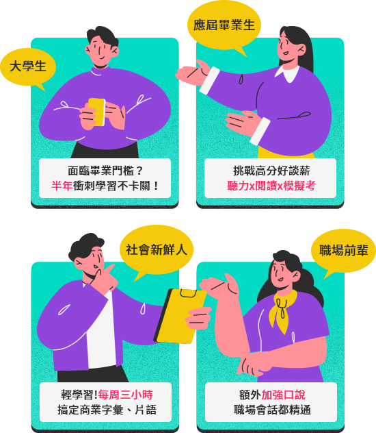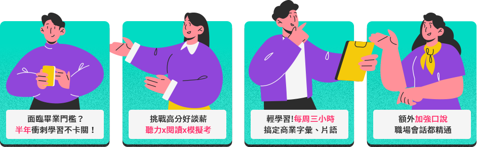 金色證書衝刺班 學習重點 有效訓練加快作答速度,突破高分一舉拿下金證 檢定助攻 教你掌握作答時間的關鍵技巧,突破高分 從商業題組出發,濃縮重點,加強答題思考邏輯 進階文法實力累積,達成多益高級能力指標 課程內容 練穩基本功,新題型完整解析,填入特定完整句 聽力邏輯速度訓練,熟悉三人對話關聯,聽力滿分關鍵 多篇閱讀連結點訓練,不用閱讀完整即能作答 文法實力累積1:代名詞、連接詞、關係詞、名詞子句 文法實力累積2:形容詞子句、假設語氣、倒裝句